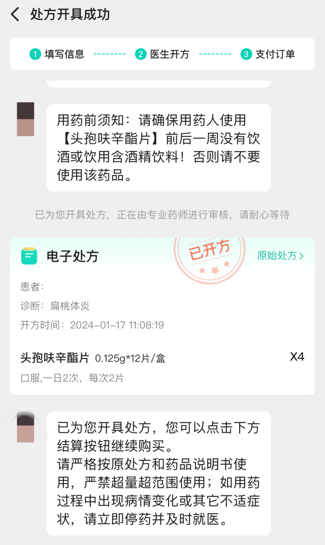 電商平臺(tái)上,記者再次搜索頭孢類(lèi)藥物,也只需提交用藥人信息,選擇已確診疾病,確認(rèn)后即可問(wèn)診開(kāi)方。點(diǎn)擊“無(wú)需補(bǔ)充,立即開(kāi)方”,不到一分鐘,處方單便已生成。