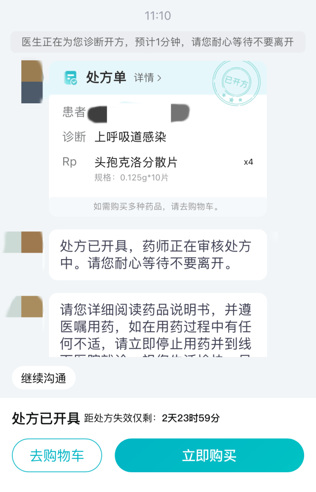 “您好,我是醫(yī)生XX,已收到您的復(fù)診開(kāi)藥訴求,正在為您診斷開(kāi)方,預(yù)計(jì)1分鐘,請(qǐng)不要離開(kāi)……”自動(dòng)發(fā)來(lái)三條問(wèn)話后,記者并未回復(fù)任何信息,一份電子處方就順利開(kāi)出。只需完成支付,處方藥就可以送貨上門(mén)。