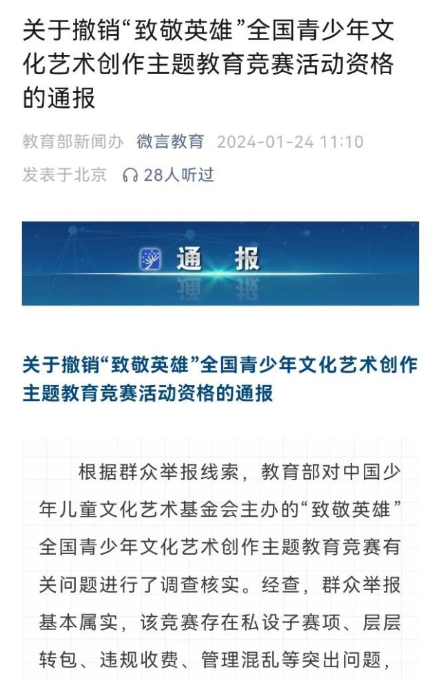 教育部1月24日通報(bào),根據(jù)群眾舉報(bào)線索,教育部對(duì)中國少年兒童文化藝術(shù)基金會(huì)主辦的“致敬英雄”全國青少年文化藝術(shù)創(chuàng)作主題教育競(jìng)賽有關(guān)問題進(jìn)行了調(diào)查核實(shí)。經(jīng)查,群眾舉報(bào)基本屬實(shí),該競(jìng)賽存在私設(shè)子賽項(xiàng)、層層轉(zhuǎn)包、違規(guī)收費(fèi)、管理混亂等突出問題,在社會(huì)上造成了惡劣影響。