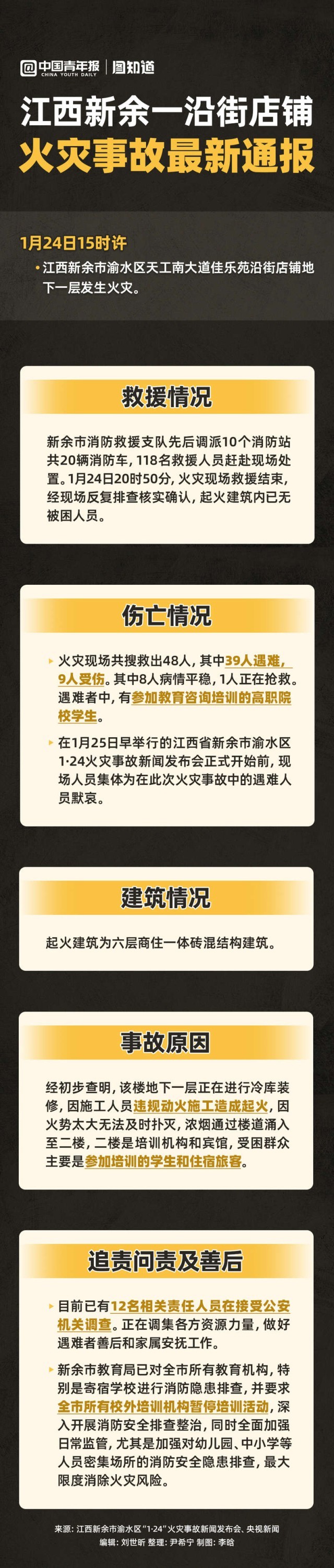 1月25日8時,江西省新余市渝水區(qū)“1·24”火災(zāi)事故新聞發(fā)布會通報,渝水區(qū)一沿街店鋪發(fā)生火災(zāi),造成39人遇難,9人受傷。遇難者中,有參加教育咨詢培訓(xùn)的高職院校學(xué)生。經(jīng)初步查明,事故原因系施工人員違規(guī)動火施工造成起火。目前,已有12名相關(guān)責(zé)任人員接受公安機(jī)關(guān)調(diào)查。此外,新余市要求全市所有校外培訓(xùn)機(jī)構(gòu)暫停培訓(xùn)活動,深入開展消防安全排查整治。