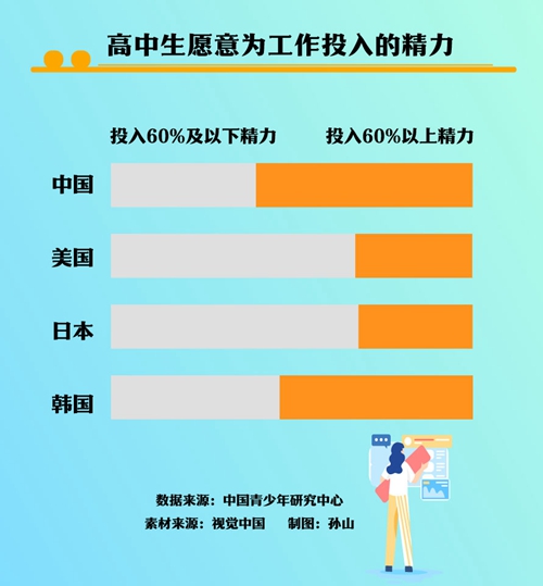 對于未來的工作,受訪高中生愿意投入多少精力?調(diào)查發(fā)現(xiàn),假設(shè)全部精力是100%,愿意為工作投入80%以上精力的中國高中生占比16.2%,愿意投入60%到80%精力的高中生占比43.8%,合計(jì)有六成受訪中國高中生愿意為工作投入60%以上精力,在四國受訪高中生中最高,其次是韓國高中生(53.3%),美國和日本高中生愿意投入60%以上精力的比例均只有三成多(32.4%和31.6%)??梢姡袊晚n國高中生更愿意投入較多精力在工作上。