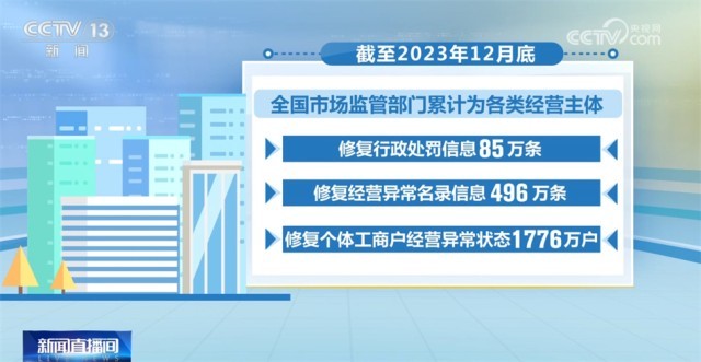 截至2023年12月底,全國市場監(jiān)管部門累計為各類經(jīng)營主體修復(fù)行政處罰信息85萬條,修復(fù)經(jīng)營異常名錄信息496萬條,修復(fù)個體工商戶經(jīng)營異常狀態(tài)1776萬戶。
