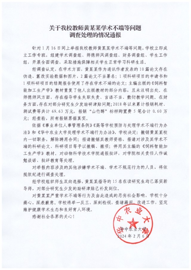 華中農(nóng)業(yè)大學(xué)通報(bào):教師黃某某學(xué)術(shù)不端等問(wèn)題調(diào)查處理的情況