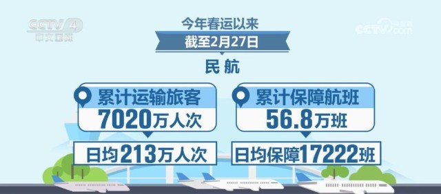 1月份,民航全行業(yè)完成運輸總周轉(zhuǎn)量116.1億噸公里,同比增長57.1%;完成旅客運輸量5731.8萬人次,同比增長44.1%,民航客運恢復(fù)程度達(dá)到疫情以來月度新高;完成貨郵運輸量75.3萬噸,同比增長53.9%,民航貨運規(guī)模連續(xù)六個月超過疫情前水平。從數(shù)據(jù)看,今年春運以來,截至2月27日,民航累計運輸旅客7020萬人次,日均213萬人次;累計保障航班56.8萬班,日均保障17222班。