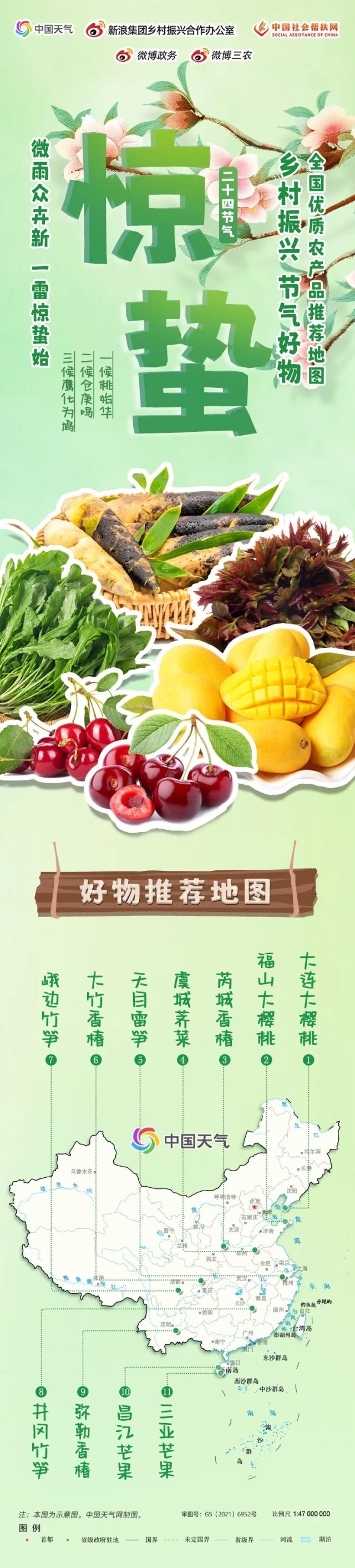 在這個春雷乍響,萬物生長的節(jié)氣里,又有哪些春季的舌尖美味呢,來看看由中國天氣網(wǎng)、中國社會幫扶網(wǎng)聯(lián)合推出的“鄉(xiāng)村振興·節(jié)氣好物”全國優(yōu)質農(nóng)產(chǎn)品推薦地圖驚蟄篇吧!