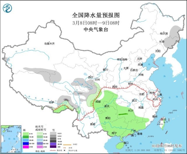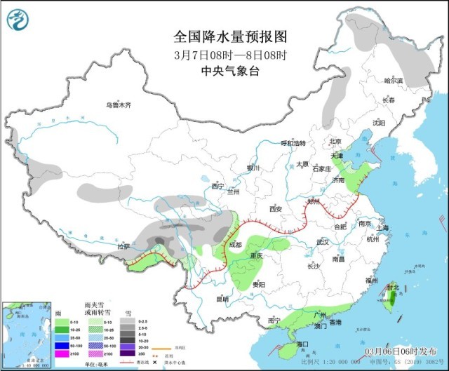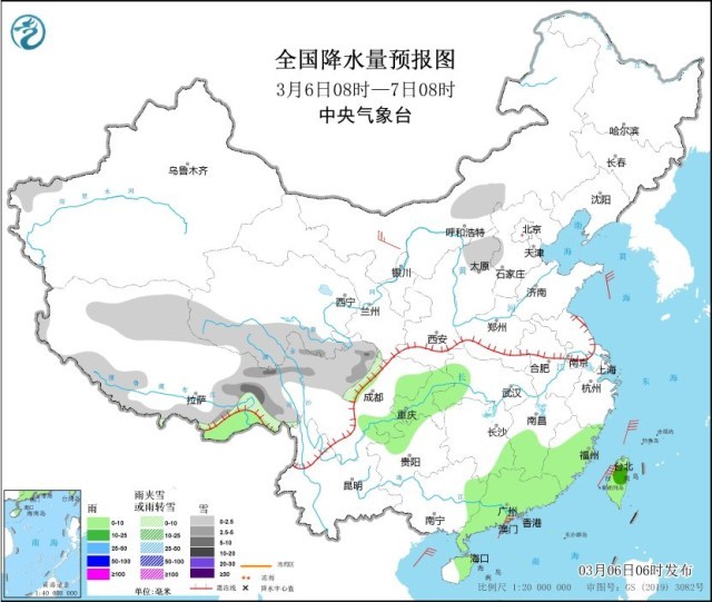 圖1 全國降水量預(yù)報(bào)圖(3月6日08時-7日08時)