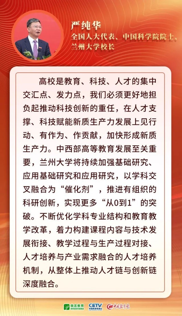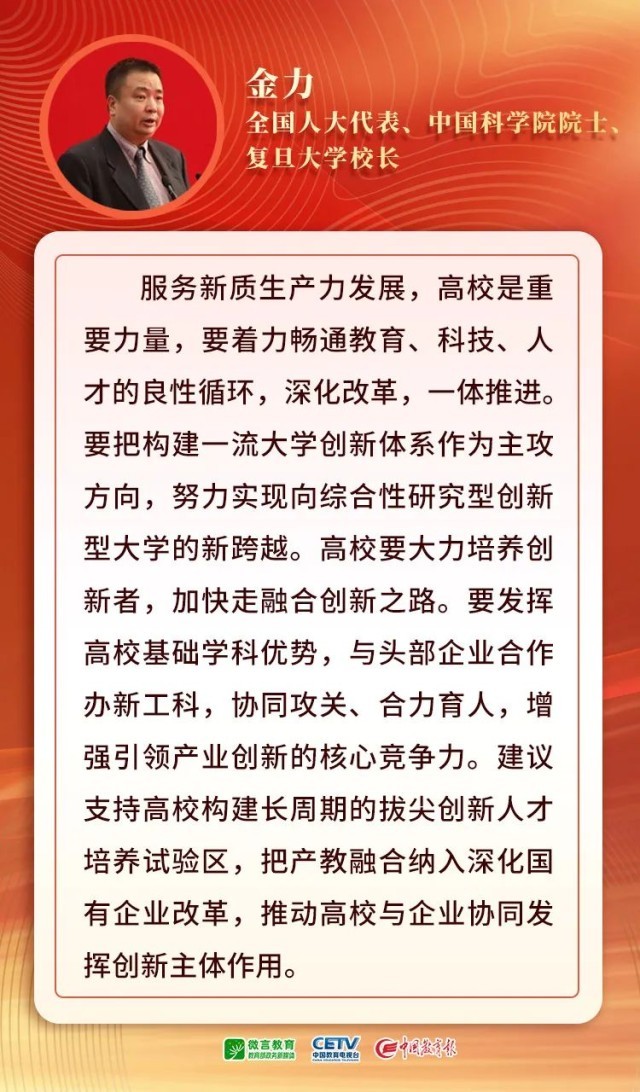 2024年政府工作報告提出,大力推進現(xiàn)代化產(chǎn)業(yè)體系建設(shè),加快發(fā)展新質(zhì)生產(chǎn)力。培育和發(fā)展新質(zhì)生產(chǎn)力,創(chuàng)新是核心要素,基礎(chǔ)和先導(dǎo)靠教育。高校如何發(fā)揮支撐作用,推動新質(zhì)生產(chǎn)力發(fā)展?5位代表委員,同時也是大學(xué)書記、校長,提出了建議,來聽他們怎么說——