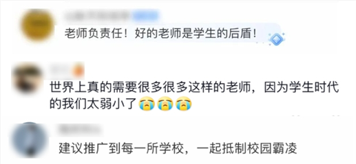 這位老師的做法,贏得了眾多網(wǎng)友的點贊:“好老師是學(xué)生的后盾”“一起抵制校園霸凌”。
