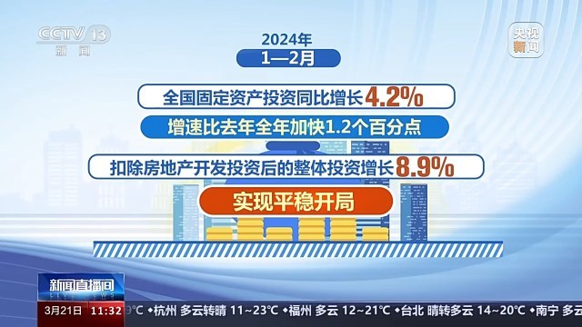 國(guó)家發(fā)展和改革委員會(huì)副主任劉蘇社介紹,今年以來(lái),國(guó)家發(fā)展改革委會(huì)同有關(guān)方面,充分發(fā)揮政府投資的帶動(dòng)放大效應(yīng),積極支持社會(huì)資本參與重大項(xiàng)目建設(shè),著力擴(kuò)大有效益的投資。1—2月,全國(guó)固定資產(chǎn)投資同比增長(zhǎng)4.2%,增速比去年全年加快1.2個(gè)百分點(diǎn);扣除房地產(chǎn)開(kāi)發(fā)投資后的整體投資增長(zhǎng)8.9%,實(shí)現(xiàn)平穩(wěn)開(kāi)局。