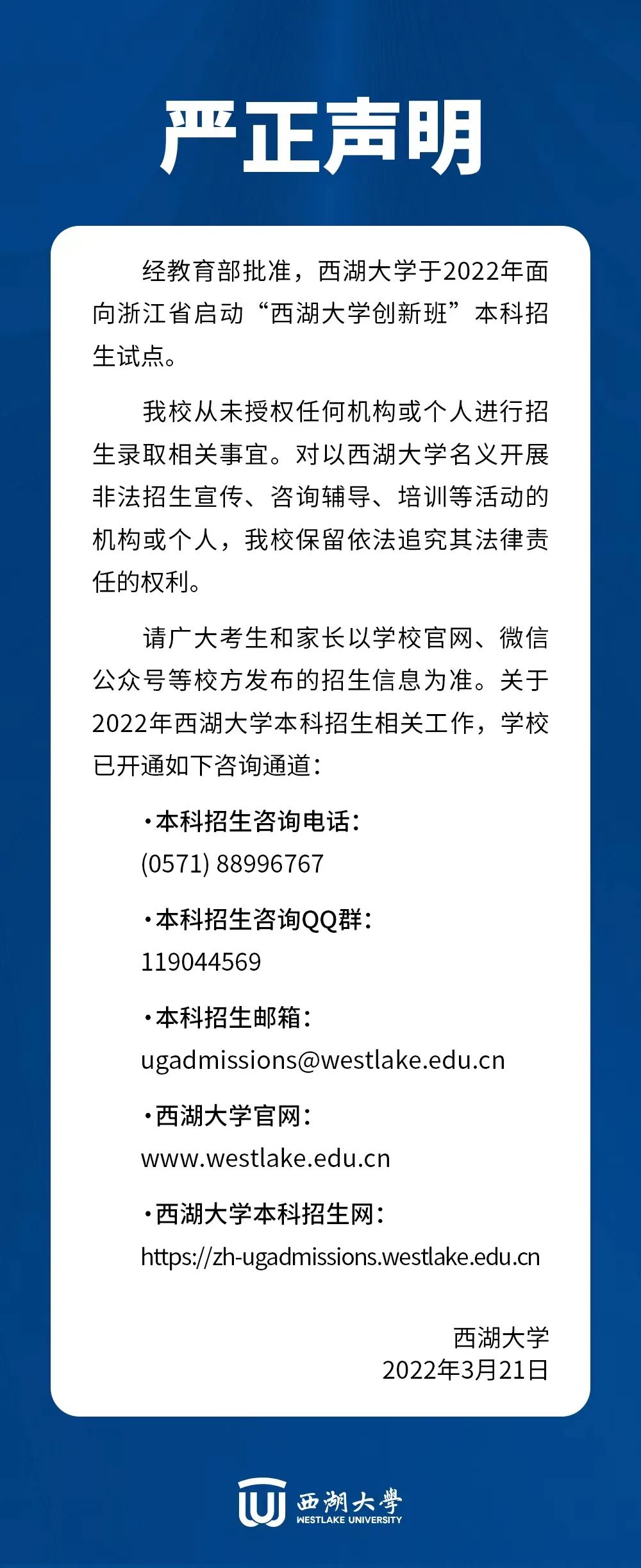 中新網(wǎng)3月21日電 據(jù)“西湖大學(xué)WestlakeUniversity”微信公眾號消息,3月21日,西湖大學(xué)發(fā)布《關(guān)于2022年西湖大學(xué)本科招生的嚴正聲明》,聲明指出,經(jīng)教育部批準(zhǔn),西湖大學(xué)于2022年面向浙江省啟動“西湖大學(xué)創(chuàng)新班”本科招生試點。該校從未授權(quán)任何機構(gòu)或個人進行招生錄取相關(guān)事宜。對以西湖大學(xué)名義開展非法招生宣傳、咨詢輔導(dǎo)、培訓(xùn)等活動的機構(gòu)或個人,該校保留依法追究其法律責(zé)任的權(quán)利。