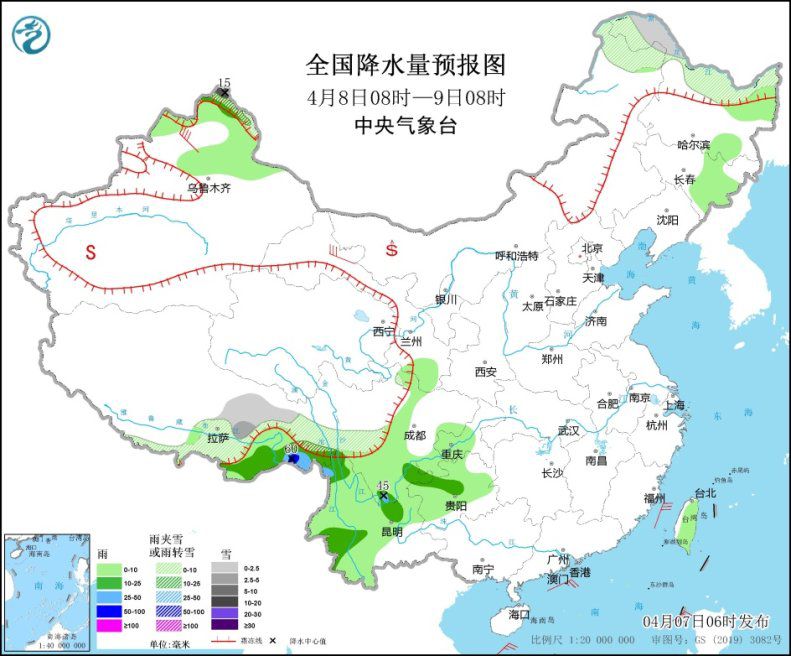 4月8日08時(shí)至9日08時(shí),新疆北疆北部、西藏東部、內(nèi)蒙古東北部、黑龍江北部等地的部分地區(qū)有小到中雪或夾雪,其中新疆北疆北部等地的部分地區(qū)有大雪,局地暴雨(10~15毫米);新疆北部、西藏東南部、黑龍江東部、吉林東部、甘肅南部、四川南部、重慶西部、貴州、云南等地的部分地區(qū)有小到中雨,其中云南北部、西藏東南部局地有大雨或暴雨(50~60毫米)。甘肅中西部、西北地區(qū)東北部、內(nèi)蒙古大部、東北地區(qū)中南部、山東半島、西藏中南部等地的部分地區(qū)有4~6級(jí)風(fēng)(見(jiàn)圖3)。