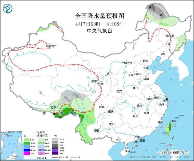 4月7日08時(shí)至8日08時(shí),新疆北疆北部、西藏東部、青海南部、川西高原西北部、內(nèi)蒙古東北部、黑龍江西北部和東南部、吉林東部等地的部分地區(qū)有小到中雪或雨夾雪,其中內(nèi)蒙古東北部、黑龍江西北部等地局地大雪(5~7毫米);西藏東南部、四川西南部、云南中西部及臺(tái)灣島等地的部分地區(qū)有小到中雨,其中西藏東南部等地局地大雨(25~45毫米)。內(nèi)蒙古中東部、西藏中南部等地的部分地區(qū)有4~6級(jí)風(fēng),其中西藏中部的部分地區(qū)有7~8級(jí)風(fēng)(見(jiàn)圖2)。