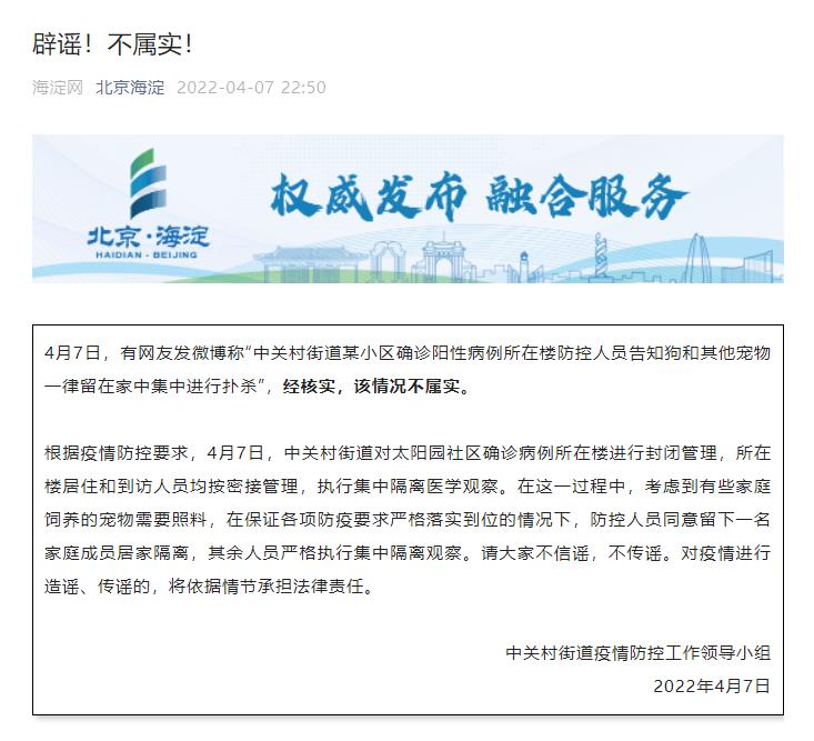 中新網(wǎng)4月8日電 據(jù)北京市海淀區(qū)融媒體中心官方微信消息,中關(guān)村街道疫情防控工作領(lǐng)導(dǎo)小組發(fā)布辟謠指出,4月7日,有網(wǎng)友發(fā)微博稱(chēng)“中關(guān)村街道某小區(qū)確診陽(yáng)性病例所在樓防控人員告知狗和其他寵物一律留在家中集中進(jìn)行撲殺”,經(jīng)核實(shí),該情況不屬實(shí)。