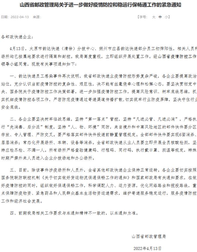 中新財經(jīng)4月15日電 13日,山西省郵政管理局發(fā)布通知緊急部署行業(yè)疫情防控和穩(wěn)運行保通暢工作 ,要求全省從業(yè)人員要立即開展全員核酸檢測,堅持應(yīng)檢盡檢、不漏一人。除此次涉疫場所外,全省其他郵政快遞企業(yè)均保持正常運轉(zhuǎn)。
