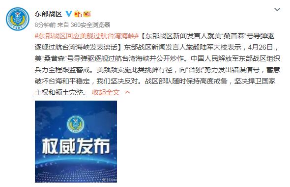 東部戰(zhàn)區(qū)回應美艦過航臺灣海峽:全程跟監(jiān)警戒