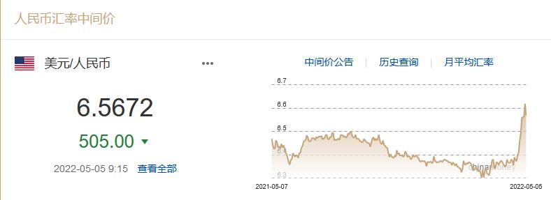 5月5日人民幣對美元匯率中間價較上日上調505點