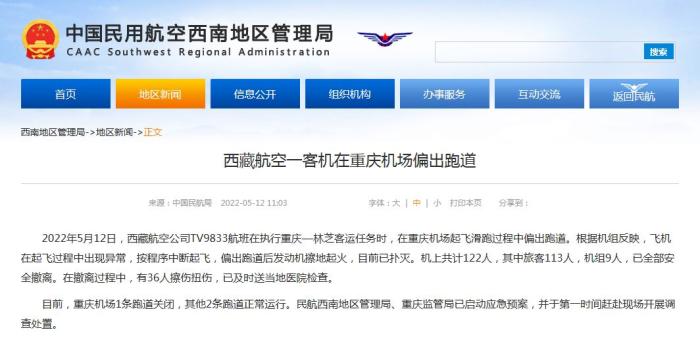 中新網(wǎng)5月12日電 據(jù)民航局網(wǎng)站消息,民航局今日就西藏航空一客機(jī)在重慶機(jī)場偏出跑道發(fā)布通報。通報稱,2022年5月12日,西藏航空公司TV9833航班在執(zhí)行重慶—林芝客運(yùn)任務(wù)時,在重慶機(jī)場起飛滑跑過程中偏出跑道。根據(jù)機(jī)組反映,飛機(jī)在起飛過程中出現(xiàn)異常,按程序中斷起飛,偏出跑道后發(fā)動機(jī)擦地起火,目前已撲滅。機(jī)上共計122人,其中旅客113人,機(jī)組9人,已全部安全撤離。在撤離過程中,有36人擦傷扭傷,已及時送當(dāng)?shù)蒯t(yī)院檢查。