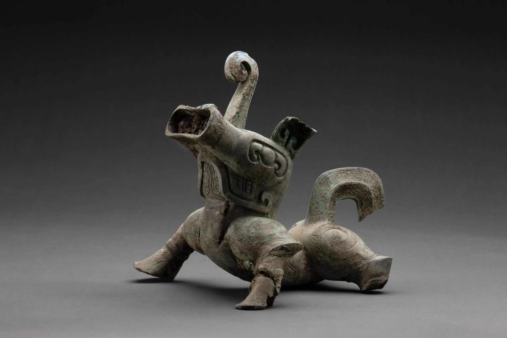 這只“萌獸”出土于三星堆3號(hào)“祭祀坑”坑底,長(zhǎng)28.5厘米、高26.4厘米、寬23厘米,大大的眼睛,嘴巴像一個(gè)扁長(zhǎng)的“喇叭”,頭上還有一撮“呆毛”,體表有云雷紋條帶裝飾,整體造型昂首挺胸,看起來(lái)壯實(shí)活潑。