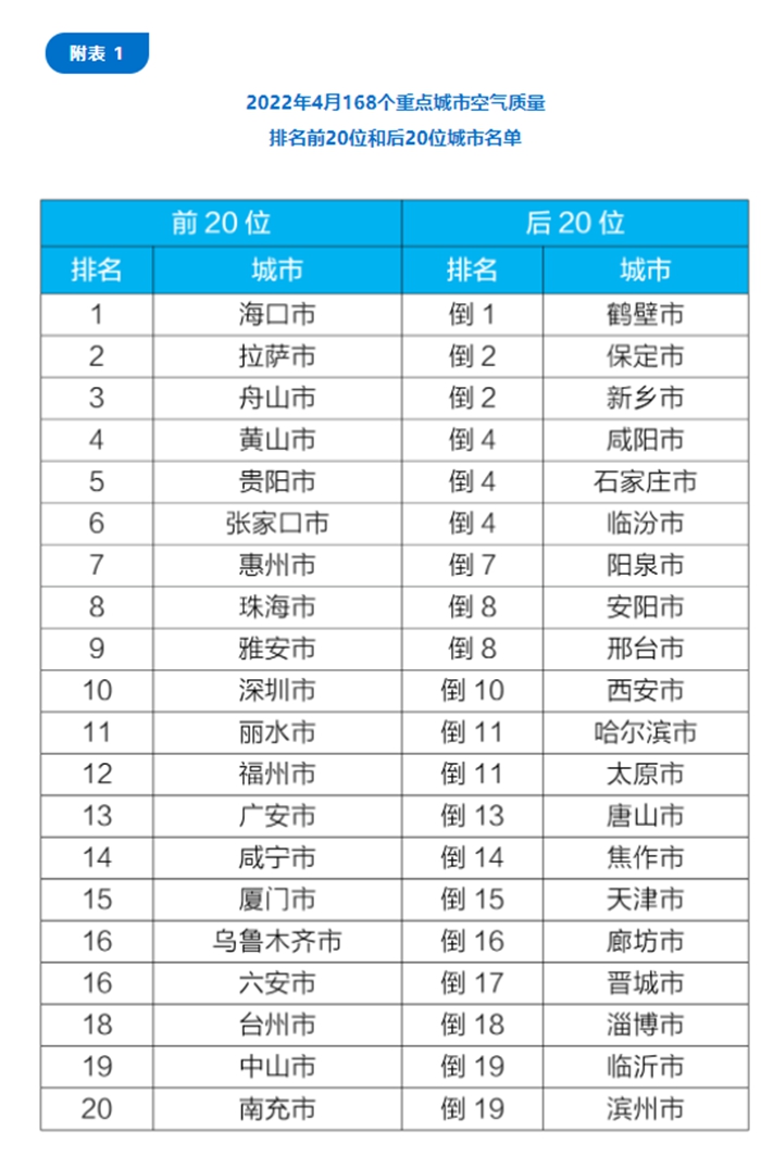 在重點城市排名中,4月,168個重點城市中,???、拉薩和舟山市等20個城市空氣質量相對較好;鶴壁、保定和新鄉(xiāng)市等20個城市空氣質量相對較差。