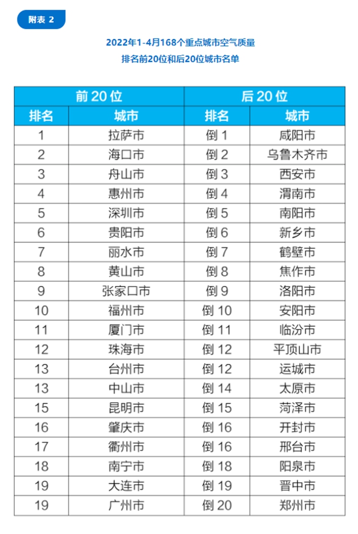 1—4月,168個重點城市中,拉薩、海口和舟山市等20個城市空氣質量相對較好;咸陽、烏魯木齊和西安市等20個城市空氣質量相對較差。(完)