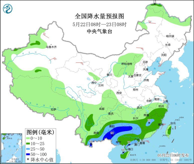 5月22日08時(shí)至23日08時(shí),西藏、青海西南部等地有小雨或陣雨,高海拔地區(qū)有小到中雪或雨夾雪;江南東部和南部、華南大部、貴州中南部、云南南部、黑龍江西北部等地部分地區(qū)有中到大雨,其中,云南南部、貴州南部、廣西北部、湖南南部、廣東西南部沿海等地部分地區(qū)有暴雨(50~90毫米)。新疆北部和南疆東部、甘肅北部、內(nèi)蒙古西部和東部等地部分地區(qū)有4~6級風(fēng)。