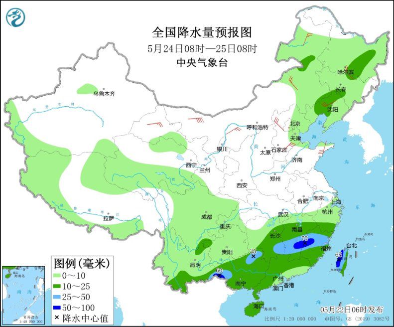 5月24日08時(shí)至25日08時(shí),西藏北部和西部、青海南部、川西高原等地有小雨或陣雨,高海拔地區(qū)有小到中雪或雨夾雪;江南中南部、華南大部、云南南部、黑龍江東部、遼寧中部、臺(tái)灣島等地部分地區(qū)有中到大雨,其中,江西南部、福建西部、云南東南部、廣西西南部、臺(tái)灣島西部等地部分地區(qū)有暴雨(50~75毫米)。東北地區(qū)中南部、華北北部和東部、黃淮北部和東部、內(nèi)蒙古、甘肅北部等地部分地區(qū)有4~6級風(fēng),內(nèi)蒙古西部部分地區(qū)有6~7級風(fēng)。