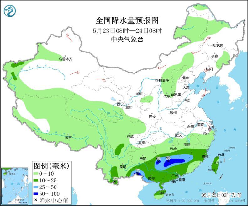 5月23日08時(shí)至24日08時(shí),西藏、青海南部、川西高原等地有小雨或陣雨,高海拔地區(qū)有小到中雪或雨夾雪;華南大部、江南南部、云南南部、臺(tái)灣島等地部分地區(qū)有中到大雨,其中,湖南南部、江西南部、廣西西南部和東北部、廣東西北部等地部分地區(qū)有暴雨(50~85毫米)。江南東部、內(nèi)蒙古中東部、東北地區(qū)中南部、甘肅北部、新疆北疆和南疆東部等地部分地區(qū)有4~6級風(fēng)。
