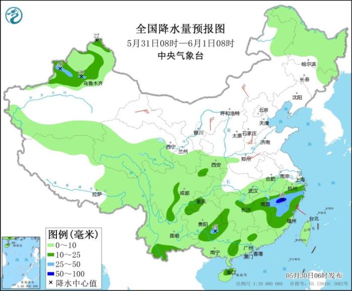 5月31日08時至6月1日08時,新疆沿天山地區(qū)和伊犁河谷、湘贛北部、浙江中南部、福建、貴州南部、廣西北部、云南南部、四川盆地東南部等地的部分地區(qū)有中到大雨,其中,江西東北部、浙江西部等地局地暴雨(50~60毫米)。內(nèi)蒙古中西部、甘肅河西、河北南部、河南東部等地的部分地區(qū)有4~5級風。黃海中部海域、臺灣以東洋面有5~6級、陣風7級的偏南到西南風,東海南部海域有4~6級、陣風7級的西南風。