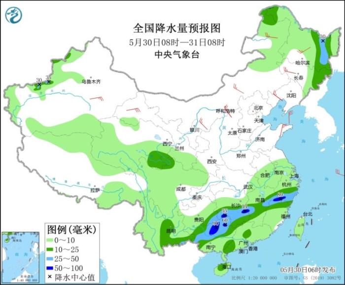 5月30日08時至31日08時,新疆西部、青藏高原北部和東部、內(nèi)蒙古東北部、黑龍江、吉林東部、江南大部、云南、貴州中南部、華南、蘇皖中南部等地的部分地區(qū)有小到中雨,其中,浙江南部、福建北部、江西中部、湖南中南部、廣西北部以及黑龍江東部、新疆南疆西部等地的部分地區(qū)有大雨,局地有暴雨(50~90毫米)。內(nèi)蒙古中東部、東北地區(qū)、山西北部、河北北部等地的部分地區(qū)有4~6級風。黃海北部和東海北部海域有4~6級、陣風7級的偏西風,東海南部和南海西南部海域有4~6級、陣風7級的西南風。