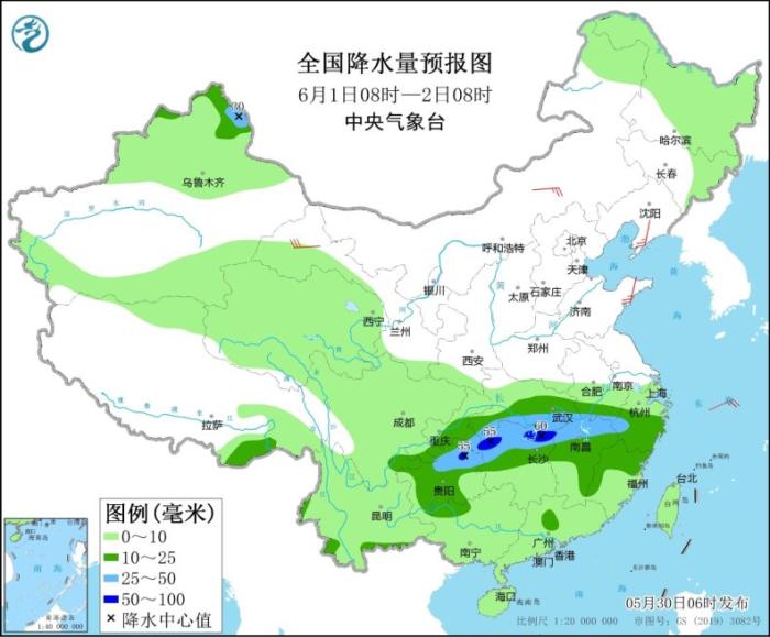 全國降水量預報圖(5月31日08時-6月1日08時)