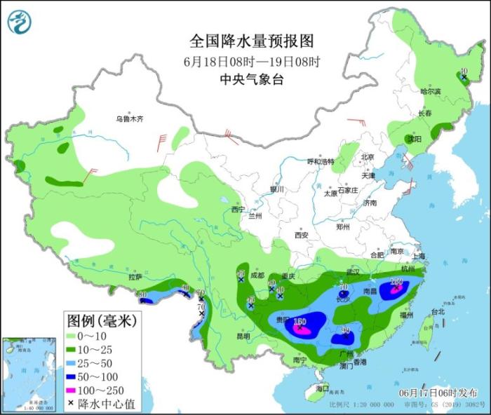 6月17日08時(shí)至18日08時(shí),廣東大部、廣西北部和中東部、福建西部和北部、貴州南部和東部、湖南西部和南部、江西中南部、浙江南部以及云南西北部、西藏東南部等地的部分地區(qū)有大到暴雨,局地大暴雨(100~180毫米)。新疆沿天山地區(qū)和南疆盆地、內(nèi)蒙古中西部、西藏中西部等地的部分地區(qū)有4~6級風(fēng),其中新疆東部部分地區(qū)風(fēng)力可達(dá)7級以上;東海南部、臺灣以東洋面、北部灣將有5~6級、陣風(fēng)7級的偏南到西南風(fēng)。