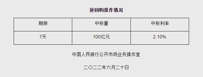 中新財(cái)經(jīng)6月20日電 據(jù)央行網(wǎng)站6月20日消息,為維護(hù)銀行體系流動(dòng)性合理充裕,2022年6月20日人民銀行以利率招標(biāo)方式開展了100億元逆回購操作,期限為7天,中標(biāo)利率2.10%。(完)