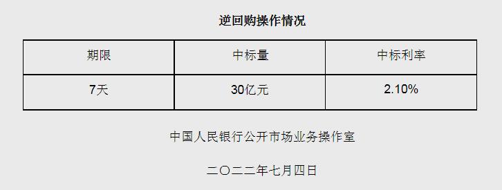 央行7月4日開(kāi)展30億元逆回購(gòu)操作 中標(biāo)利率2.10%