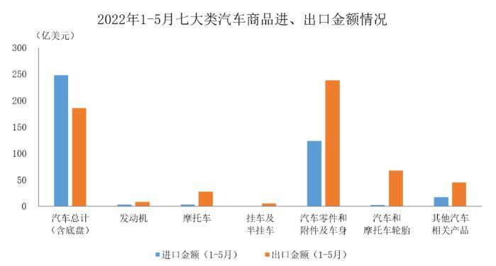 2022年5月,汽車商品進出口總額為201.9億美元,環(huán)比增長4.3%,同比增長9.8%。其中進口金額環(huán)比下降15.3%,同比下降9.5%;出口金額環(huán)比增長21.9%,同比增長26.8%。