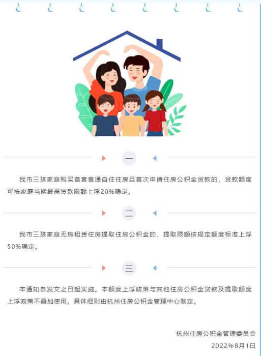 中新網(wǎng)8月1日電 據(jù)“杭州公積金發(fā)布”公眾號8月1日消息,杭州住房公積金管理委員會(huì)發(fā)布通知,加大對三孩家庭解決基本住房問題的支持力度。