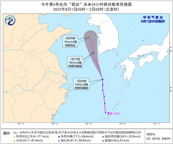 此外,今年第6號臺風(fēng)“翠絲”已于昨天下午生成,其中心今天早晨05時(shí)位于韓國濟(jì)州島南偏東方向約250公里的東海北部海面上,預(yù)計(jì)將以每小時(shí)30-35公里的速度向北偏西方向移動,強(qiáng)度逐漸減弱并消散。