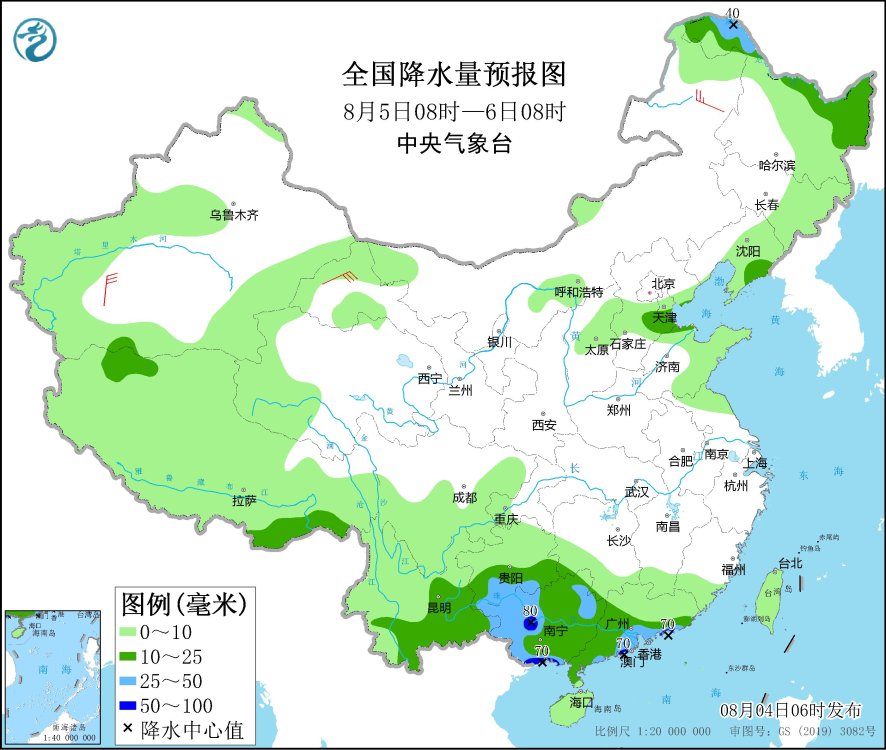8月5日08時至6日08時,黑龍江北部、廣東中西部、廣西、貴州南部、云南中東部、西藏東南部等地部分地區(qū)有中到大雨,其中,廣東南部沿海、廣西西南部等地局部地區(qū)有暴雨(50~80毫米)。甘肅西部、內(nèi)蒙古東北部、新疆南疆盆地等地部分地區(qū)有4~6級風。