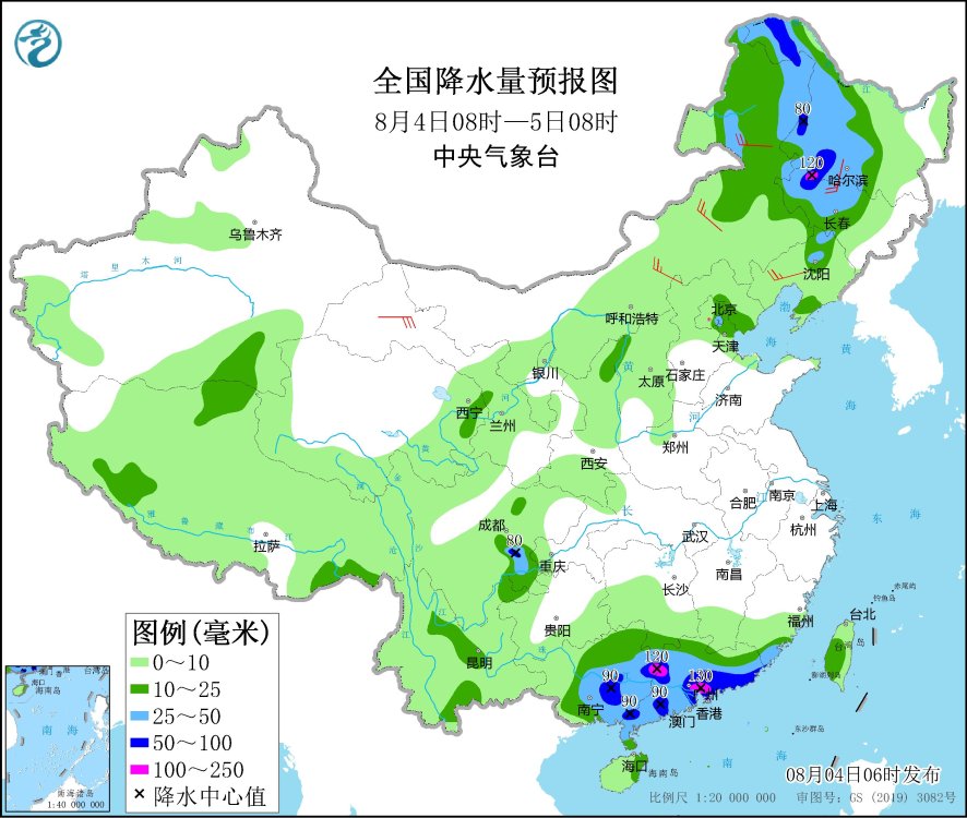 8月4日08時至5日08時,內(nèi)蒙古東部、遼寧北部、吉林中西部、黑龍江中西部、北京東部、天津北部、福建東南部、廣東大部、廣西大部、四川盆地南部、云南北部和南部、青海東部等地有中到大雨,其中,吉林西部、黑龍江西部、廣東東南部和西部、廣西東部、四川盆地南部等地部分地區(qū)有暴雨,局地有大暴雨(100~130毫米)。甘肅西部、內(nèi)蒙古中東部等地部分地區(qū)有4~6級風。