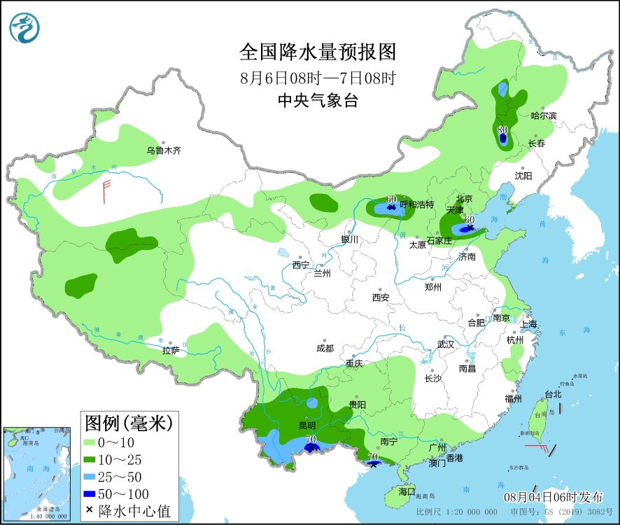 8月6日08時至7日08時,陜西北部、內(nèi)蒙古河套地區(qū)和東北部、吉林西部、黑龍江西南部、北京東部、河北中部、天津南部、山東北部、廣西西南部、云南大部等地部分地區(qū)有中到大雨,其中,內(nèi)蒙古東南部、河北東部、山東北部、廣西西南部、云南南部等地局部地區(qū)有暴雨(50~80毫米)。新疆南疆盆地部分地區(qū)有5~6級風。