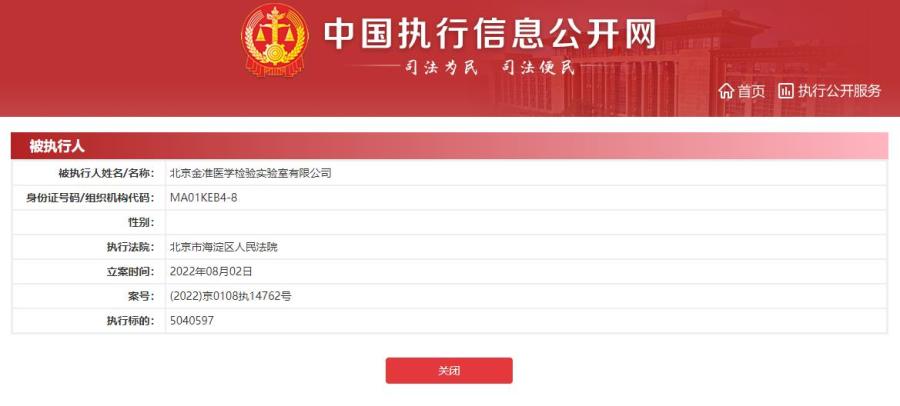 北京金準(zhǔn)醫(yī)學(xué)實(shí)驗(yàn)室成被執(zhí)行人 執(zhí)行標(biāo)的504萬