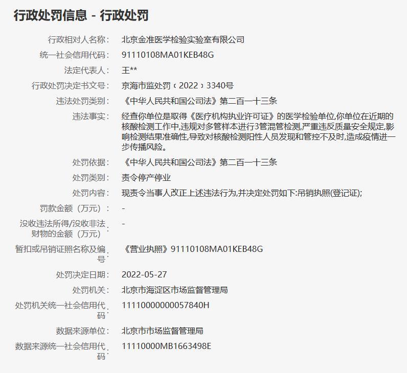 據(jù)信用中國(北京)網(wǎng)站5月31日行政處罰信息顯示,北京金準(zhǔn)醫(yī)學(xué)檢驗(yàn)實(shí)驗(yàn)室有限公司在近期的核酸檢測(cè)工作中,違規(guī)對(duì)多管樣本進(jìn)行3管混管檢測(cè),嚴(yán)重違反質(zhì)量安全規(guī)定,影響檢測(cè)結(jié)果準(zhǔn)確性,導(dǎo)致對(duì)核酸檢測(cè)陽性人員發(fā)現(xiàn)和管控不及時(shí),造成疫情進(jìn)一步傳播風(fēng)險(xiǎn)。北京市海淀區(qū)市場監(jiān)督管理局決定吊銷其執(zhí)照(登記證)。(中新財(cái)經(jīng))
