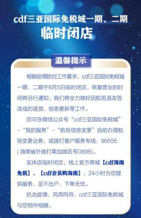中新網(wǎng)8月5日電 cdf三亞國際免稅城官方微信公眾號消息,根據(jù)疫情防控要求,三亞國際免稅城一期、二期8月5日起臨時閉店,恢復(fù)營業(yè)時間將另行通知,并將做好因航班退改簽造成的退貨、信息更新等工作。(中新財經(jīng))
