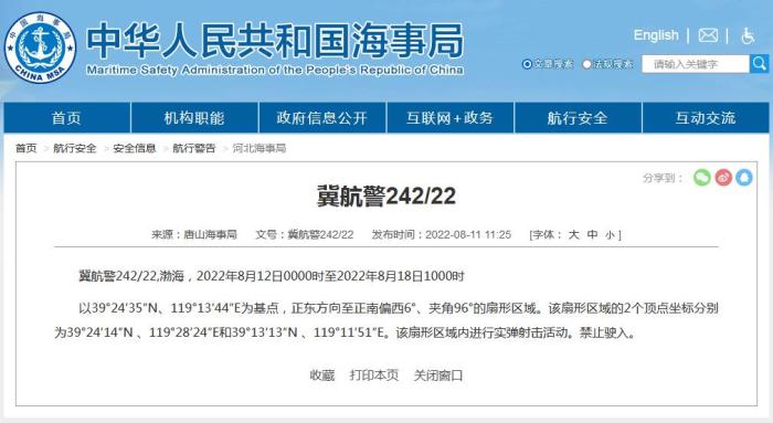 中新網(wǎng)8月12日電 據(jù)中國海事局網(wǎng)站消息,唐山海事局發(fā)布航行警告,8月12日0時至8月18日10時,渤海以39°24′35″N、119°13′44″E為基點,正東方向至正南偏西6°、夾角96°的扇形區(qū)域(該扇形區(qū)域的2個頂點坐標分別為39°24′14″N 、119°28′24″E和39°13′13″N 、119°11′51″E)內(nèi)進行實彈射擊活動,禁止駛?cè)搿?/p>
