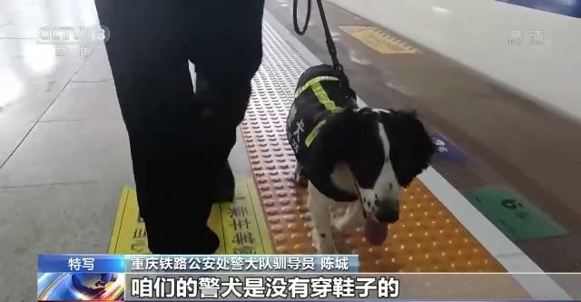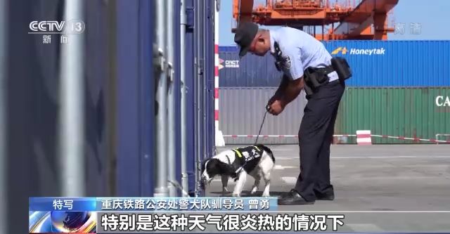重慶鐵路公安處警犬隊(duì)馴導(dǎo)員 陳城:現(xiàn)在地表溫度是非常高的,你看現(xiàn)在都是接近60℃了,咱們的警犬是沒有穿鞋子的,相當(dāng)于就是(它的)肉墊直接接觸地面,它是非常痛苦的,所以咱們(正午)基本上不會(huì)在室外工作了。