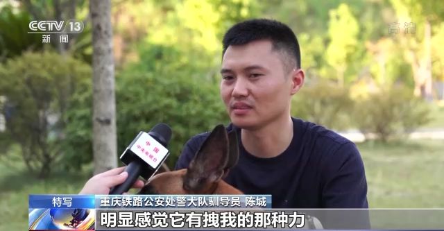 重慶鐵路公安處警犬隊(duì)馴導(dǎo)員 陳城:有一次我們出去找一個(gè)人的時(shí)候,在山林里搜救,我在行進(jìn)的途中不小心差點(diǎn)摔下去了,因?yàn)樽е?閃電的)警繩,明顯感覺它有拽我的那種力,把我拖上去的感覺挺感動(dòng)的,當(dāng)時(shí)內(nèi)心有一顫。