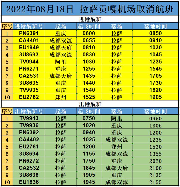 因公共安全原因,8月18日,拉薩貢嘎機(jī)場部分航班取消,計(jì)劃執(zhí)行進(jìn)出港航班18架次,分別為: