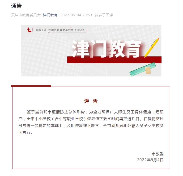 中新網(wǎng)9月5日電 天津市教育委員會4日晚在其官方微信發(fā)布通告稱,鑒于當前天津市疫情防控總體形勢,為全力確保廣大師生員工身體健康,經(jīng)研究,全市中小學校(含中等職業(yè)學校)恢復線下教學時間再推遲幾日。在疫情防控形勢進一步穩(wěn)定的基礎上,及時恢復線下教學。全市幼兒園和外籍人員子女學校參照執(zhí)行。