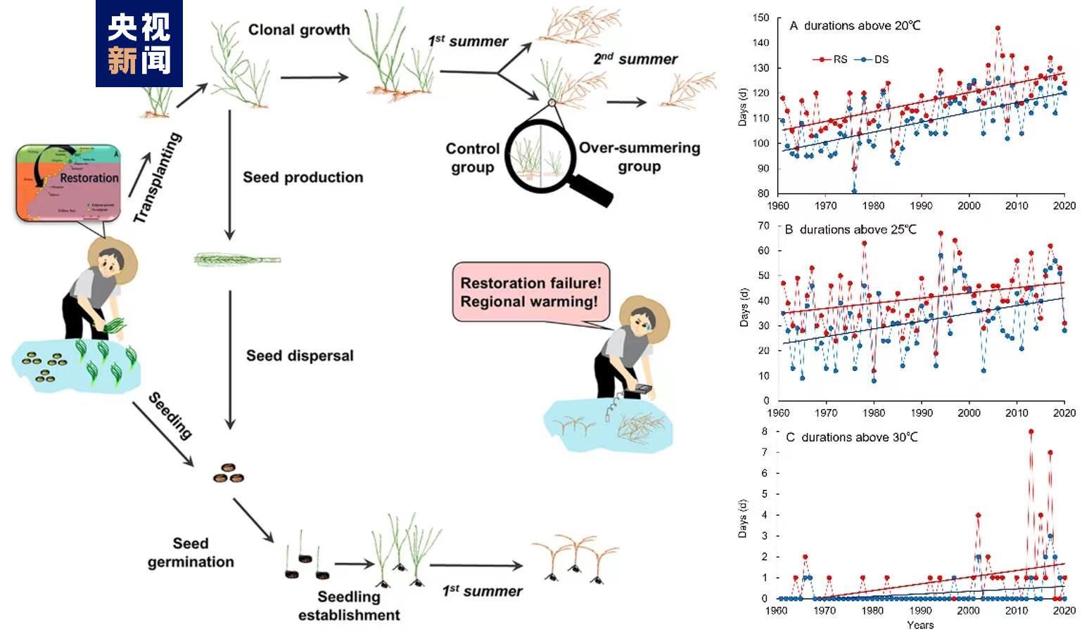 為確定鰻草地理分布北移是否由區(qū)域變暖所致,2016年至2021年期間,科研人員從青島灣獲取鰻草植株和種子,在日照石臼所海域共開展了16次鰻草植株移植和種子種植實(shí)驗(yàn),監(jiān)測海草生長狀況及水溫等環(huán)境參數(shù),并進(jìn)行海草生化分析和轉(zhuǎn)錄組分析。