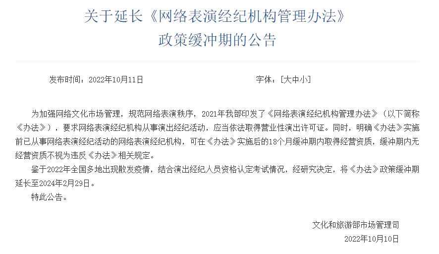 文旅部:延長《網絡表演經紀機構管理辦法》政策緩沖期
