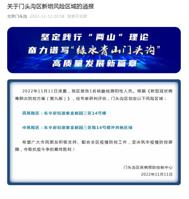 中新網(wǎng)11月11日電 據(jù)“北京門頭溝”微信公眾號消息,北京市門頭溝區(qū)疾病預(yù)防控制中心11日發(fā)布通報(bào)稱,2022年11月11日凌晨,門頭溝區(qū)報(bào)告1名核酸檢測陽性人員。根據(jù)《新型冠狀病毒肺炎防控方案(第九版)》,經(jīng)專家研判評估,門頭溝區(qū)劃定以下風(fēng)險(xiǎn)區(qū)域: